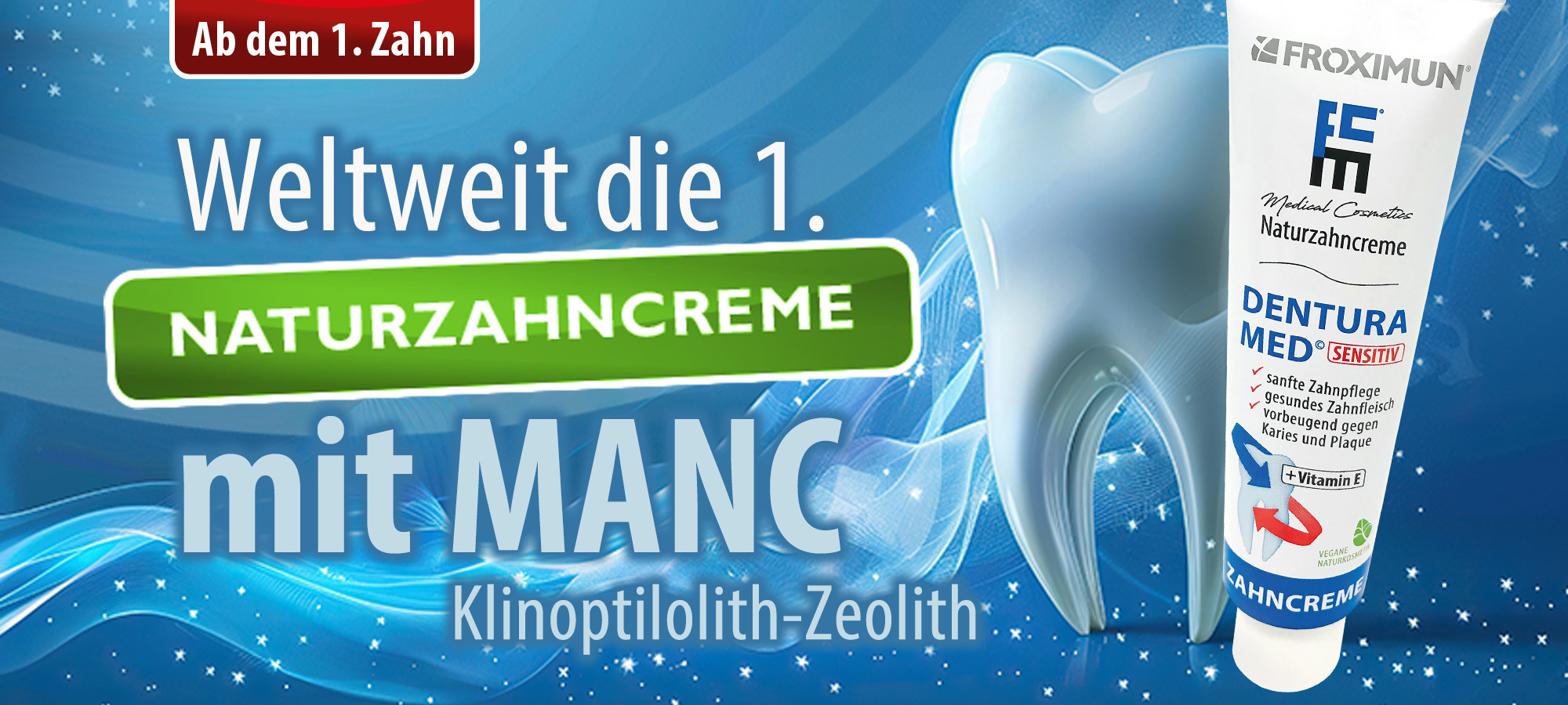 Einzigartige Wirkstoffkombination auf MANC® Basis zur Mund- und Zahnpflege. Die neue Generation der Mund- und Zahnpflege aus der Apotheke unserer Natur.Zahnpasten gibt es viele, schön weiß, toll im Geschmack, reich an chemischen Zusatzstoffen und einer Vielzahl von Gesundheitsversprechen.DENTURA MED Sensitiv ist anders!Farbe: naturbelassenGeschmack: natürlichInhaltstoffe: besonders wertvollBei der Herstellung wird bewusst verzichtet auf: Menthol, Fluorid, Tenside, Parabene sowie Mikroplastik.DENTURA MED SensitivKombiniert die entzündungshemmende und sanfte Wirkung von Klinoptilolith-Zeolith (MANC®) mit wertvollen Ölen, Vitaminen und Mineralien.Dauerhaft weiße Zähne und gesundes Zahnfleisch durch schonende MANC® Putzkörper mit nachweislich niedrigem RDA-Wert und optimalem Reinigungseffekt. sanfte Zahnpflege gesundes Zahnfleisch vorbeugend gegen Karies und Plaque plus Vitamin EDENTURA MED Sensitiv Naturzahncreme 75mlFördert die Zahnfleisch- und ZahngesundheitStärkt die natürliche Barriere der Mundschleimhaut und beugt Entzündungen vorSenkt die Schmerzempfindlichkeit sensibler Zähne und wirkt Zahnfleischbluten entgegenFür die ganze Famile ab dem 1. ZahnInhaltsstoffe:AQUA, ZEOLITE (MANC®), SILICA, GLYCERIN, XYLITOL, XANTHAN GUM, SODIUM BICARBONATE, MENTHA VIRIDIS LEAF OIL, CITRUS GRANDIS PEEL OIL, CITRUS LIMON, PEEL OIL, TOCOPHEROL, LIMONENE