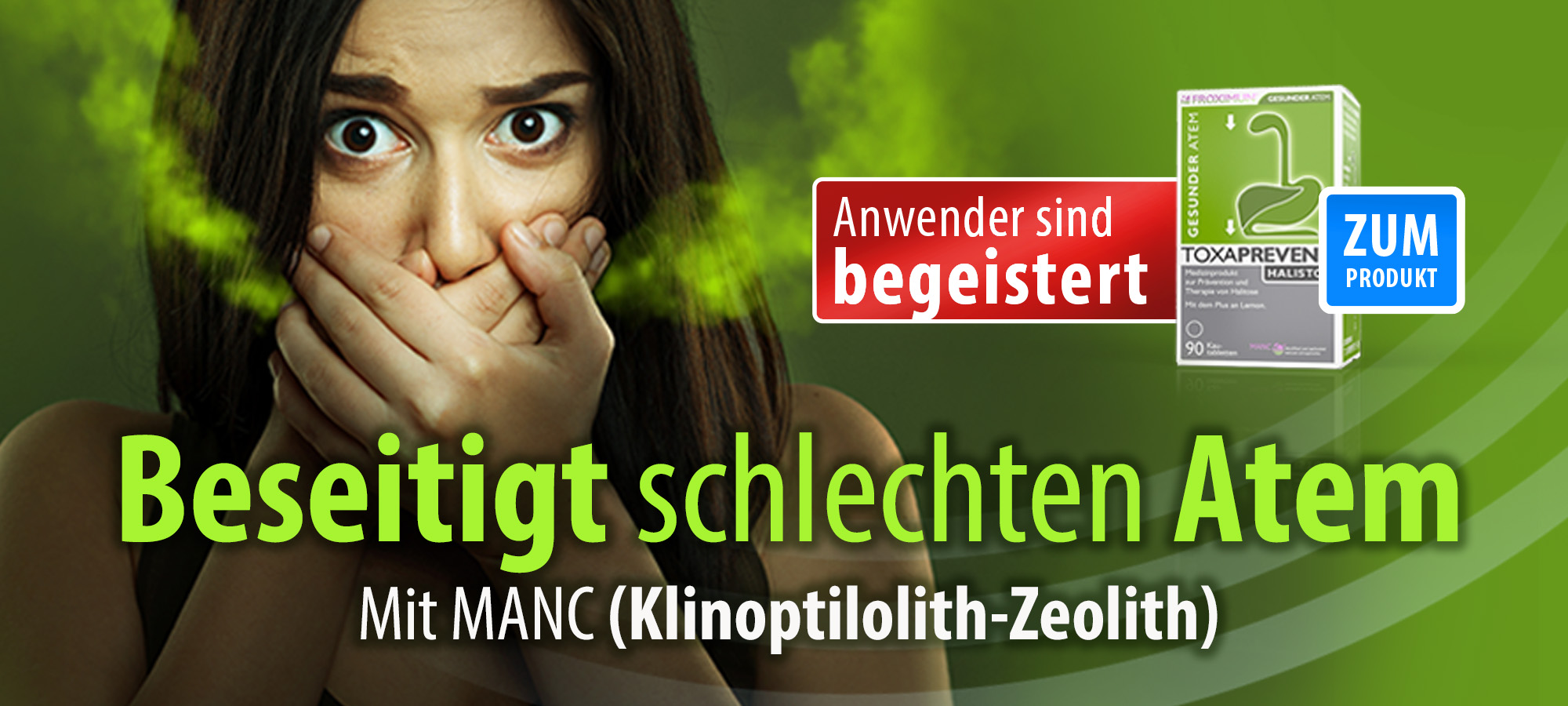 "GESUNDER ATEM" Innovation die schmeckt - Funktionalität mit Biss. Eine Kautablette auf dem Vormarsch, die ein nahes Beieinander wieder angenehm macht! TOXAPREVENT® HALISTOP® als Kautablette dient der natürlichen Regulation von Halitose (Mundgeruch) durch Bindung und Ausleitung ammoniumhaltiger Geruchsstoffe. In der Mundhöhle, besonders auf der Zunge und an entzündetem Zahnfleisch, werden geruchsaktive Substanzen gebunden und ausgeleitet. Durch die Reduktion von Histamin wird die Wundheilung entzündeter Stellen beschleunigt. Besonders durch den Einsatz von Stevia und Lemon verleiht es dem Produkt einen angenehmen Geschmack. Der Vorteil der süßen Komponente ist seine nicht kariogene Wirkung und seine Eignung für Diabetiker. Mit Zahnärzten entwickelt und von zufriedenen Anwendern empfohlen!Die Ursachen für schlechten Atem beseitigen, statt ihn zu überdecken.Der kleine praktische Blister á 10 Kautabletten findet in jeder Hosentasche Platz und kann zu jeder Zeit genutzt werden. Kautabletten entnehmen - kauen oder lutschen - fertig. TOXAPREVENT® HALISTOP® in Kautablettenform - ein innovatives Neuprodukt aus dem Hause FROXIMUN.Anwendung:Bei unerwünschter Konzentration von nachfolgenden Stoffen im Mundraum:HistaminAmmoniumIhre Vorteile:einfache Anwendung für unterwegskein Anrühren und keine zusätzliche Flüssigkeit notwendigfür die ganze Familie geeignetglutenfrei, laktosefreinicht kariogenPackungsinhalt:90 Kautabletten à 1200 mgInhaltsstoffe:MANC® (modifizierter, aktivierter Naturklinoptilolith-Zeolith)IsomaltLemonaromaHydroxypropylcelluloseMagnesiumstearatStevia