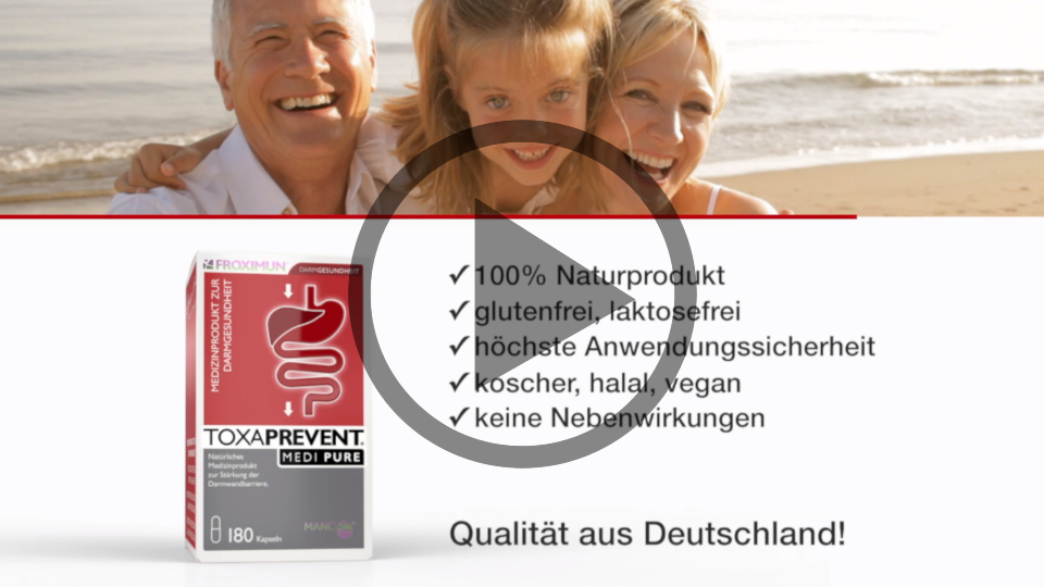 Ein natürliches Medizinprodukt in Kapselform, Made in Germany. Reinstes MANC® (modifizierter, aktivierter Naturzeolith-Klinoptilolith), in einem besonders aufwendigen Blister zum Schutz der Produktfunktionalität in Pharmaqualität verpackt. Die pflanzliche Kapsel beinhaltet 400mg MANC® und ist in verschiedenen Packungsgrößen erhältlich. TOXAPREVENT® MEDI PURE stärkt die Darmwandbarriere unter anderem durch die Bindung und Ausleitung von Reiz- und Schadstoffen und kann somit auch zur Entlastung der Stoffwechselorgane beitragen. MEDI PURE in Kapselform wird nicht verstoffwechselt und durchläuft den unteren Verdauungstrakt wie ein Schwamm, nimmt dabei Schadstoffe auf und leitet diese auf natürlichem Wege aus. Verbessert dadurch die Basis für eine gesunde Darmflora und begünstigt die Ansiedlungsbedingungen für Darmbakterien. Die Anwendung ist besonders nach Antibiotikatherapien zu empfehlen.Das klassische, mineralische Medizinprodukt MEDI PURE auf der Basis von Zeolith-Klinoptilolith hat sich bereits national sowie international millionenfach bewährt. Schauen Sie sich bitte dazu auch die unabhängigen Bewertungen der Anwender an. MEDI PURE unterstützt die körpereigenen Prozesse und kann so präventiv (vorbeugend) oder zur Lösung Ihrer gesundheitlichen Probleme angewandt werden. Bestellen Sie dieses Produkt jetzt und machen auch Sie Ihre positiven Erfahrungen mit den Original-Produkten aus dem Hause FROXIMUN „Naturprodukte mit der Urkraft der Natur für ein langes und gesundes Leben“Entwicklung, Produktion, Zulassung Made in GermanyDie Entwicklung sowie die Produktion von MEDI PURE als mineralisches, stoffliches Medizinprodukt finden ausschließlich in Deutschland durch die FROXIMUN AG statt. MEDI PURE ist sicher und funktional in der Anwendung und als qualitativ hochwertiges Medizinprodukt zur Behandlung und Linderung von Erkrankungen für die gesamte EU zertifiziert.100%iges NaturproduktGlutenfrei, laktosefreiInhaltsstoffe koscher, halal, vegetarisch, veganHohe AnwendungssicherheitSanfte Regeneration, gut verträglichFür die gesamte Familie geeignet!AnwendungDie Anwendung dieses Naturproduktes auf der Basis von Klinoptilolith-Zeolith ist einfach! Falls von Ihrem Arzt oder Therapeuten nicht anders verordnet, entnehmen Sie jeweils ca. 30 Minuten vor der Mahlzeit 1-2 Kapseln der Blister-Verpackung und nehmen diese mit ca. 0,2l stillem Wasser ein. MEDI PURE stärkt die Darmwandbarriere bei wiederkehrender physischer Belastung und reduziert Entzündungsmediatoren durch die Bindung und der natürlichen Ausleitung von Reiz- und Schadstoffen. Da Schadstoffe von MEDI PURE aufgenommen werden, bevor Sie in den Blutkreislauf gelangen, kann es die Stoffwechselorgane wie Leber und Nieren entlasten und auch damit Ihre Selbstheilungskräfte unterstützen.AnwendungsbereicheTOXAPREVENT® MEDI PURE unterstützt die körpereigenen Prozesse und kann so zur Lösung vielleicht auch Ihrer gesundheitlicher Probleme beitragen. Sind die körpereigenen Schutzbarrieren im Verdauungstrakt gestört bzw. in ihrer Funktionalität eingeschränkt, kann es zu folgenden Symptomen kommen:Bauchschmerzen, auch chronischNahrungsmittelunverträglichkeitenMüdigkeit, AntriebslosigkeitKonzentrationsschwächeSchlechte LeberwerteSchlechte BlutwerteWenn diese Symptome auch bei Ihnen auftreten, dann könnte die Anwendung von MEDI PURE genau die richtige Entscheidung für Sie sein!Blister, Kapsel, Inhaltsstoffe, ProdukteinlageDer Inhaltsstoff MANC® von TOXAPREVENT® MEDI PURE wird durch eine außerordentlich aufwendige Blister-Verpackung mit innenliegender Werkstoffkapsel vor Beschädigungen oder Verunreinigungen geschützt. Die kostenintensive Kapselhülle, ein pflanzliches Produkt langjähriger Forschung, ist 100% magensäurebeständig und schützt somit den aktivierten Inhaltsstoff MANC®. Das Kapselmaterial besteht aus Cellulose, Gellan und ist als koscher, halal und vegetarisch anerkannt.MANC®: Enthält keine tierischen Bestandteile, Blut oder dessen Nebenprodukte sowie Alkohol und Mikroplastik. Bei der Produktion von MANC® kommen ausschließlich Rohstoffe mineralischen Ursprungs zum Einsatz.Eine Kapsel enthält 400 mg MANC® (modifizierter, aktivierter, Naturklinoptilolith) als kompaktiertes Pulver, zur verzögerten Werkstoffabgabe.Eine Packung TOXAPREVENT® MEDI PURE 60 enthält: 3 Blister á 20 Kapseln (400 mg pro Kapsel), Gebrauchsinformation.UmverpackungAuch die hochwertige Umverpackung macht das originale Produkt aus dem Hause FROXIMUN unvergleichbar und soll den Zeolith-Liebhaber vor Fehleinkäufen von billigen Plagiat-Produkten schützen.Besondere Merkmale, wie z.B. ein auf der Umverpackung sich befindlicher QR-Code für den Zugang zum FROXIMUN-Infoportal, um die Gebrauchsinformation in verschiedenen Landessprachen auslesen zu können und ein silbernes MANC-Logo mit integrierter Microschrift, das das Fälschen von Kartonagen ausschließt, sind Merkmale dafür, dass es sich wirklich um originale Produkte aus dem Hause FROXIMUN® handelt.Herstellungszertifizierung, Zulassung MADE in GERMANYMedizinprodukte der TOXAPREVENT® MEDI-Serie durchlaufen aufwendige Konformitätsbewertungsverfahren nach 93/42/EWG sowie ein Zertifizierungsverfahren nach EU-Norm (EN ISO 13485:2016). Alle Prozesse unterliegen jährlichen Überwachungsaudits, die durch Benannte Stellen durchgeführt werden.MANC® ist eine geschützte Markenbezeichnung. Das Verfahren zur Bindung von Schwermetallen und Ammonium durch Zeolith® als pharmazeutisches Produkt ist durch ein erweitertes EU-Patent (Nr. EP1942914) urheberrechtlich geschützt. Die Bindung von Aminen und deren Salzen (Histamin) durch MANC® ist ebenfalls EU-patentrechtlich geprüft und geschützt (EP 2358642).Die Herstellung von MANC®, dessen Aufbereitung, einschließlich des speziellen Mikronisierungsverfahrens wird unter strengsten Qualitätsvorgaben ausschließlich durch die FROXIMUN AG am Standort D-38838 Schlanstedt durchgeführt und durch externe, akkreditierte Labore ü
