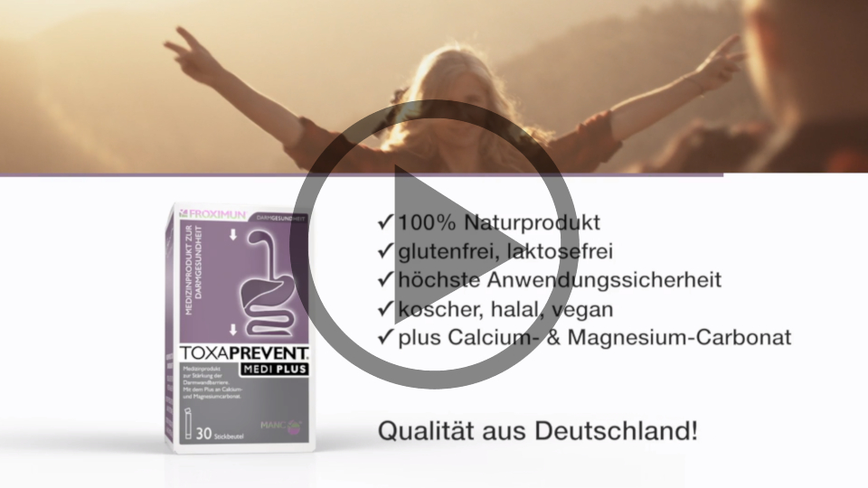 Ein natürliches Medizinprodukt in Pulverform, Made in Germany. Reinstes MANC® (modifizierter, aktivierter Naturzeolith-Klinoptilolith) mit dem Plus an Calcium- und Magnesiumcarbonat, in einem besonders aufwendigen 3g Einzel-Stick zum Schutz der Produktfunktionalität, in Pharmaqualität verpackt. MEDI PLUS ist in verschiedenen Packungsgrößen erhältlich. MEDI PLUS stärkt die Darmwandbarriere unter anderem durch die Bindung und Ausleitung von Reiz- und Schadstoffen und kann somit auch zur Entlastung der Stoffwechselorgane beitragen. MEDI PLUS in Pulverform wird nicht verstoffwechselt und durchläuft den gesamten Verdauungstrakt wie ein Schwamm, nimmt dabei Schadstoffe auf und leitet diese auf natürlichem Wege aus. Da Schadstoffe von MEDI PLUS aufgenommen werden, bevor Sie in den Blutkreislauf gelangen, kann es die Stoffwechselorgane wie Leber und Nieren entlasten und auch damit Ihre Selbstheilungskräfte unterstützen. Im Nachfolgenden wird darauf hingewiesen, welche Erfahrungen Anwender sogar bei Sodbrennen machten.Das klassische, mineralische Medizinprodukt TOXAPREVENT MEDI PLUS auf der Basis von Zeolith-Klinoptilolith hat sich bereits national sowie international millionenfach bewährt. Schauen Sie sich bitte dazu auch die unabhängigen Bewertungen der Anwender an. MEDI PLUS unterstützt die körpereigenen Prozesse und kann so präventiv (vorbeugend) oder zur Lösung Ihrer gesundheitlichen Probleme angewandt werden. Bestellen Sie dieses Produkt jetzt und machen auch Sie Ihre positiven Erfahrungen mit den Original-Produkten aus dem Hause FROXIMUN „Naturprodukte mit der Urkraft der Natur für ein langes und gesundes Leben“Entwicklung, Produktion, Zulassung Made in GermanyDie Entwicklung sowie die Produktion von MEDI PLUS als mineralisches, stoffliches Medizinprodukt finden ausschließlich in Deutschland durch die FROXIMUN AG statt. MEDI PLUS ist sicher und funktional in der Anwendung und als qualitativ hochwertiges Medizinprodukt zur Behandlung und Linderung von Erkrankungen für die gesamte EU zertifiziert.100%iges NaturproduktGlutenfrei, laktosefreiInhaltsstoffe koscher, halal, vegetarisch, veganHohe AnwendungssicherheitSanfte Regeneration, gut verträglichFür die gesamte Familie geeignet!AnwendungDie Anwendung dieses Naturproduktes auf der Basis von Klinoptilolith-Zeolith ist einfach! Falls von Ihrem Arzt oder Therapeuten nicht anders verordnet, entnehmen Sie jeweils 30 Minuten vor der Mahlzeit einen Pulver-Stick der Stickverpackung, verrühren ihn in ca. 0,2 Liter stillem Wasser und trinken das Glas aus. Anwender berichten, dass es ihnen guttut, wenn sie MEDI PLUS nach dem Zähneputzen, also direkt vor dem zu Bett gehen, einnehmen. Die Wirkung von MEDI PLUS beginnt bereits in der Mundhöhle und setzt sich über die Speiseröhre, dem Magen und dem Darm fort. Auf Grund der Durchströmung des Magenbereiches mit MEDI PLUS kommt es bei Menschen, die unter chronischem Sodbrennen leiden, laut Anwenderberichten oftmals in kurzer Zeit nach der Einnahme zu einer schnellen Linderung. Dies ist zwar nicht die eigentliche Zweckbestimmung des Produktes, jedoch eine angenehme positive Nebenwirkung, meinen MEDI PLUS Anwender. Einfach ausprobieren, Sie werden begeistert sein!MEDI PLUS stärkt die Darmwandbarriere bei wiederkehrender physischer Belastung und reduziert Entzündungsmediatoren durch die Bindung und der natürlichen Ausleitung von Reiz- und Schadstoffen. Da Schadstoffe von MEDI PLUS aufgenommen werden, bevor Sie in den Blutkreislauf gelangen, kann es die Stoffwechselorgane wie Leber und Nieren entlasten und auch damit Ihre Selbstheilungskräfte unterstützen. Diagramm: Bindung von Reiz- und SchadstoffenAnwendungsbereicheTOXAPREVENT® MEDI PLUS unterstützt die körpereigenen Prozesse und kann so zur Lösung gesundheitlicher Probleme beitragen. Sind die körpereigenen Schutzbarrieren im Verdauungstrakt gestört bzw. in ihrer Funktionalität eingeschränkt, kann es zu den nachfolgenden Symptomen kommen.Entzündungen im Mund- und RachenraumMagenschmerzen, SodbrennenChronische BauchschmerzenNahrungsmittelunverträglichkeitenMüdigkeit, Antriebslosigkeit, KonzentrationsschwächeSchlechte Leber- und BlutwerteWenn diese Symptome auch bei Ihnen auftreten, dann könnte die Anwendung von MEDI LUS genau die richtige Entscheidung für Sie sein!Dosierstick, InhaltsstoffeDie wertvollen Inhaltsstoffe von TOXAPREVENT® MEDI PLUS werden durch eine außerordentlich aufwendige Mehrschicht Stick-Verpackung vor Lichteinfluss, Verunreinigungen sowie einer vorzeitigen Werkstoffreaktion des MANC‘s geschützt. Es ist durch die Einzelstickverpackung optimal dosierbar. Auf Kurzreisen oder Tagesausflügen ist es ausreichend, nur einige Pulver-Sticks der Hauptverpackung zu entnehmen. Diese finden schnell in jeder noch so kleinen Waschtasche Platz oder werden einfach in die Hemd- oder Jackentasche verstaut. MEDI PLUS zählt bereits durch die Art der exklusiven Einzelverpackung zum absoluten Premiumbereich bzgl. der sich auf dem Markt befindlichen medizinischen Zeolithprodukte und sollte Ihr täglicher Begleiter sein!1 Stick enthält 3000 mg PulverInhaltsstoffe: MANC® (Natur-Zeolith-Klinoptilolith)Calciumcarbonat, MagnesiumcarbonatMANC® ist ein modifizierter, aktivierter Naturzeolith-Klinoptilolith und enthält keine tierischen Bestandteile, Blut oder dessen Nebenprodukte, Alkohol oder Mikroplastik. Bei der Produktion von MANC® kommen ausschließlich Rohstoffe mineralischen Ursprungs zum Einsatz.Calcium- und Magnesiumcarbonat: Pharmaqualität, allergenfrei, koscher, halal, vegetarisch, veganDas zugesetzte Calcium-Magnesiumcarbonat dient in erster Linie dazu, die Magenpassage mit einem erhöhten PH-Wert für den Hauptwerkstoff MANC® passierbar zu machen und nicht zu ernährungsphysiologischen Zwecken. Führen Sie bitte bei Bedarf von Calcium-Magnesiumcarbonat, diese Stoffe in Form von Nahrungsergänzungsmitteln weiterhin gesondert zu.UmverpackungAuch die hochwertige Umverpackung macht das originale Produ